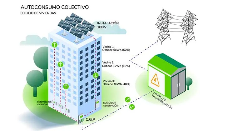 El autoconsumo colectivo permite a varios usuarios compartir la energía generada por un único sistema de generación renovable. Ya sean paneles solares instalados en un edificio o una comunidad de vecinos.
